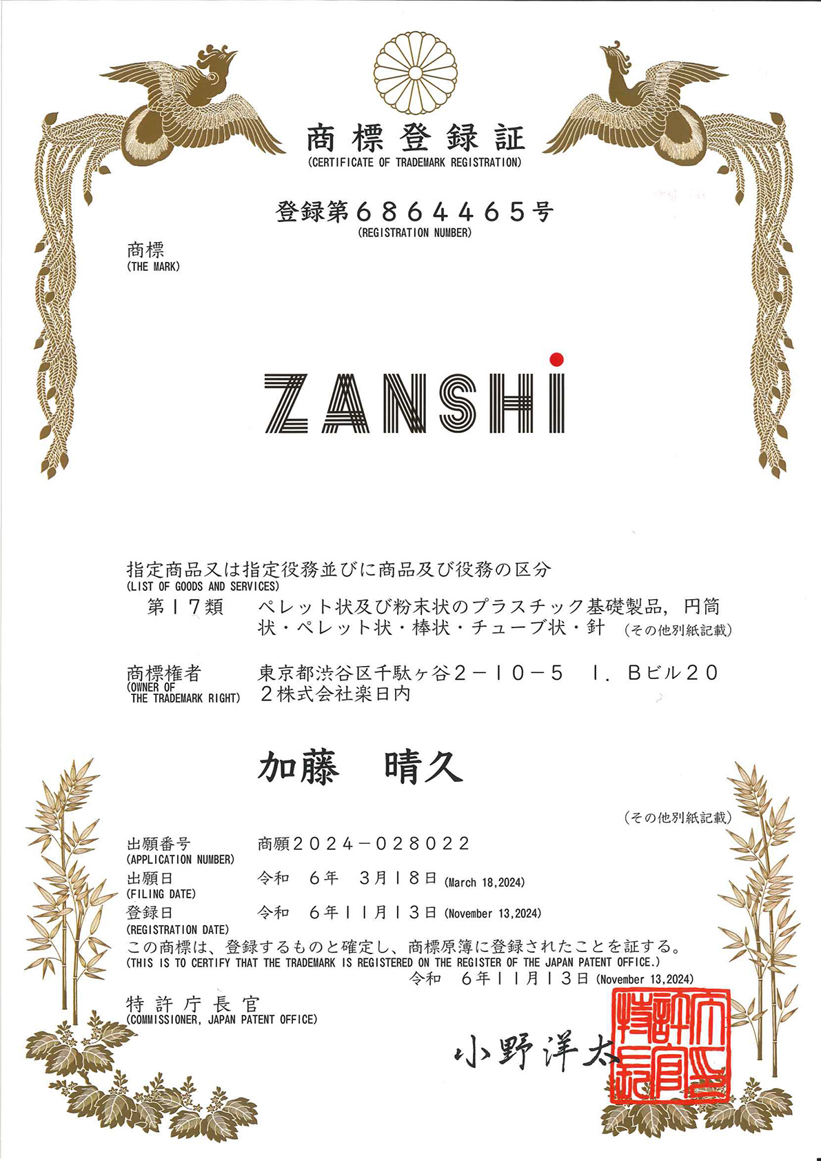 NEWS 2025.1.1 「ZANSHI」商標登録のお知らせ 弊社が特許庁に出願しておりました「ZANSHI」が2024年11月13日に登録されましたのでお知らせいたします。 <商標登録の概要> 商標 商標権者 株式会社楽日 登録番号 第6864465号 登録日 2024年11月13日 区分 第17、22、23、24、25類 CATEGORIES INFO NEWS BACK